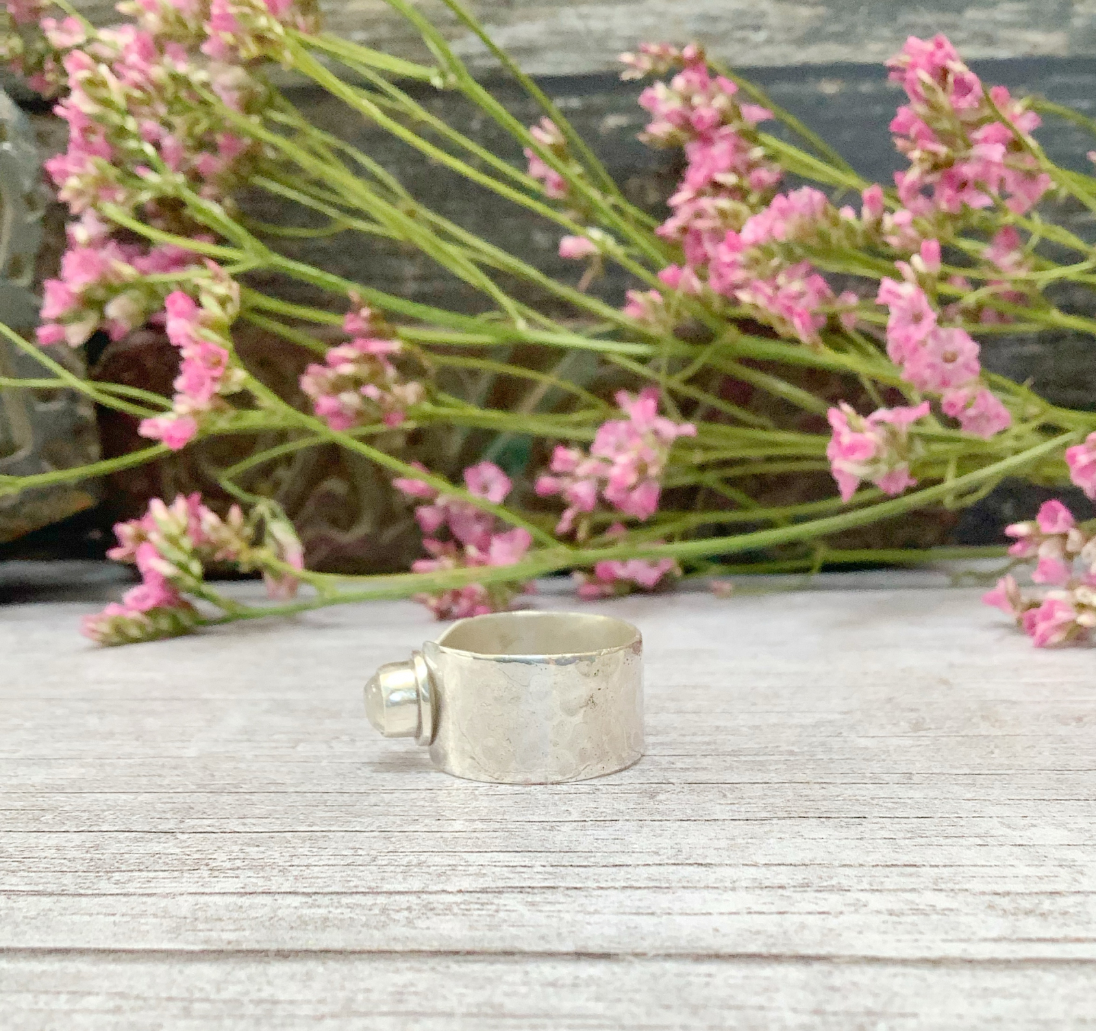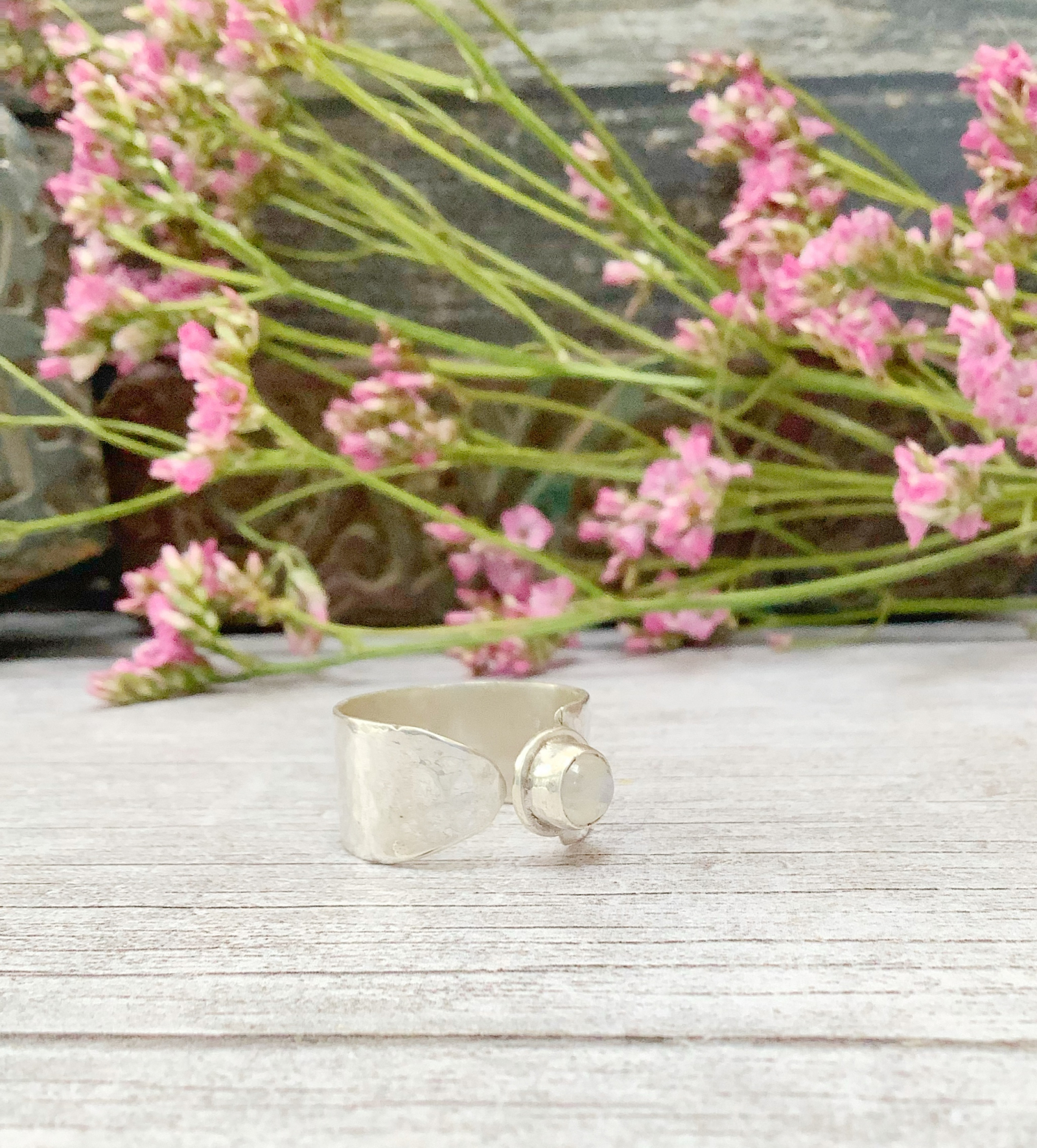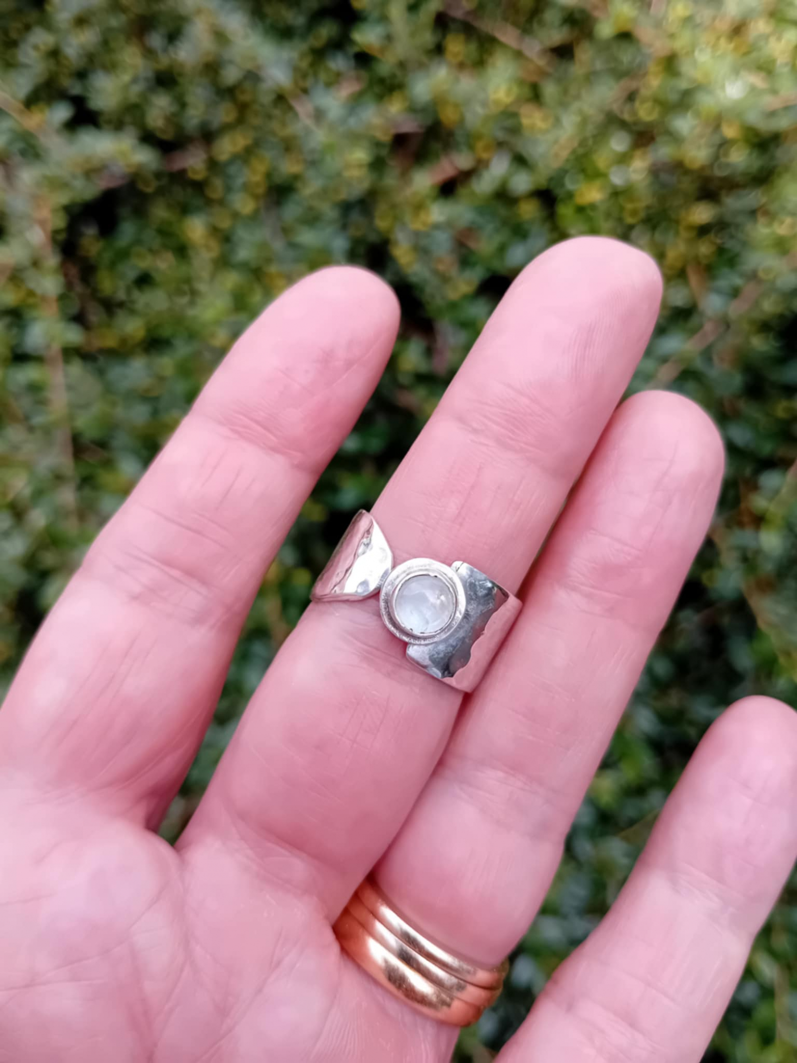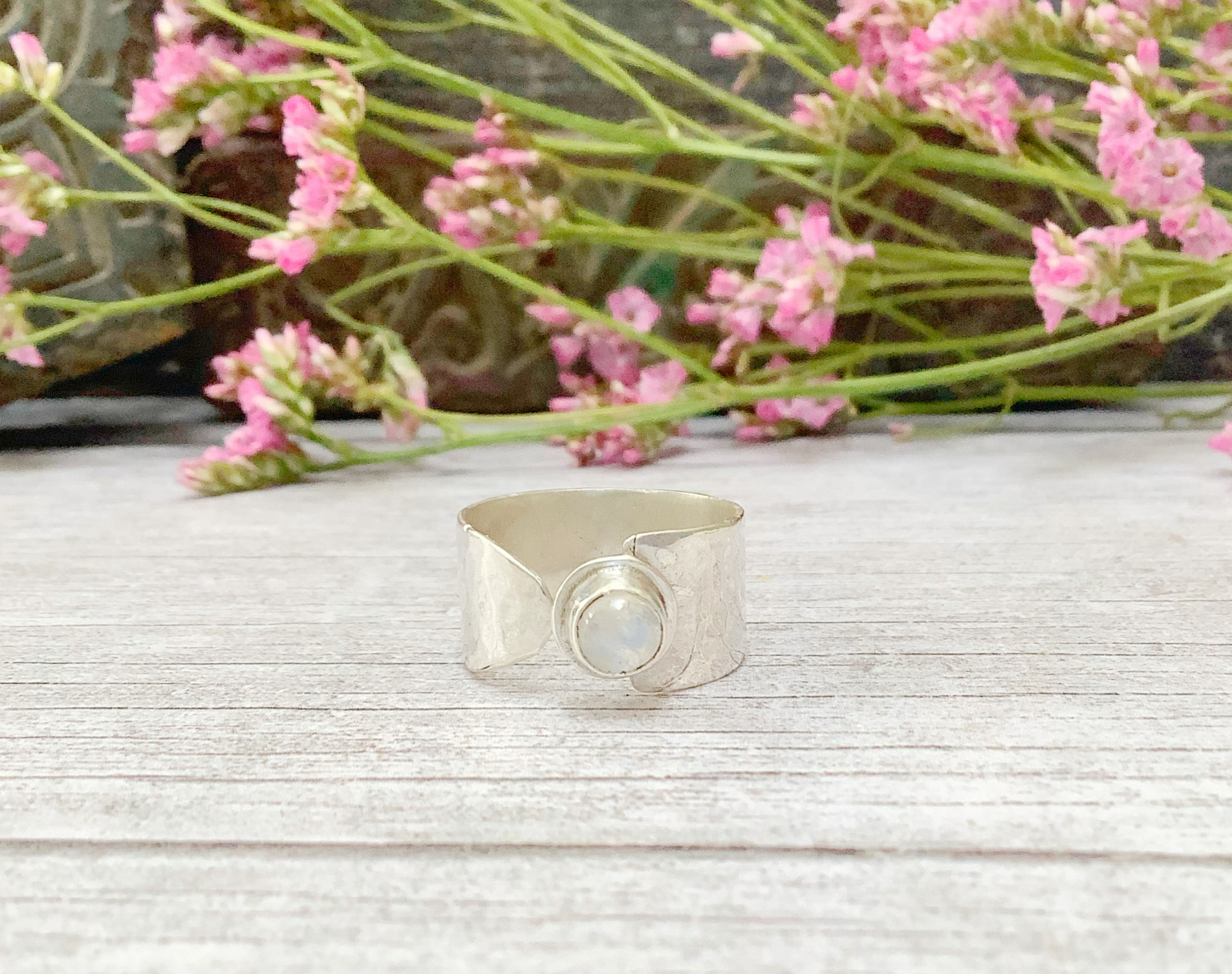 Small piece of moonstone set in a sterling silver band, which has been left open. The ring measures UK size P but is slightly adjustable by gently squeezing or pulling apart