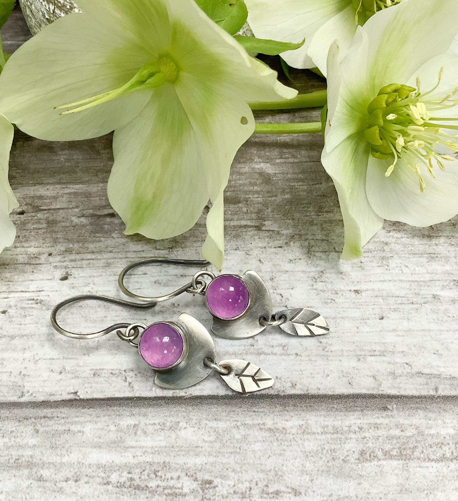 Pale pink jade set in sterling silver with leaf embellishments. Oxidised for a darker finish. Approx 1.75” from the top of sterling earwires